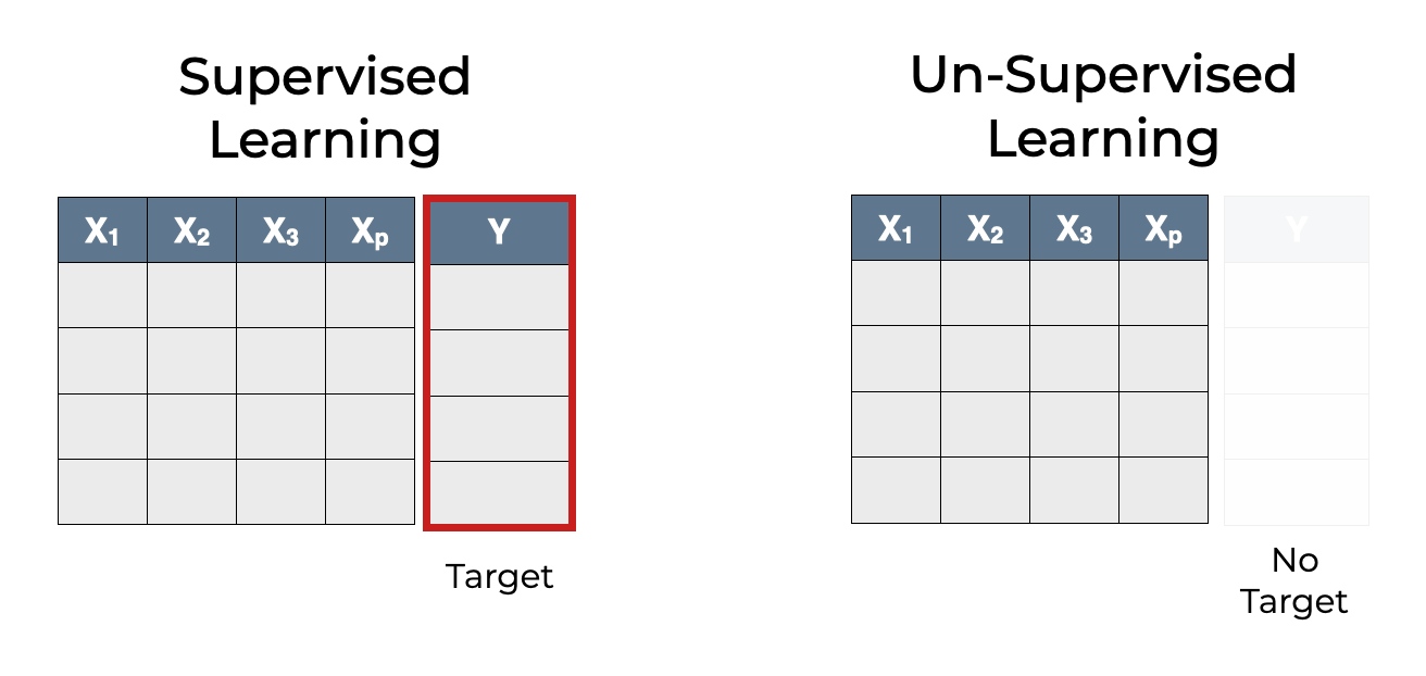 - Unsupervised Learning - Using unlabelled input data to learn about pattern in data, e.g. inputting unlabelled animal pictures and having your machine try to group them