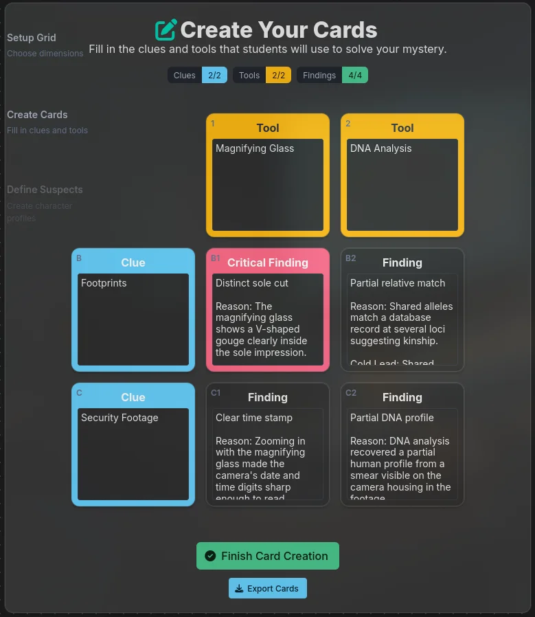The core concept: In order to match clues and tools to findings, educators can put any challenge they want. For instance, they can put numbers on the clues and tools, and in order to find the correct finding card, they need to complete a math equation to get the right ID for the findings card.