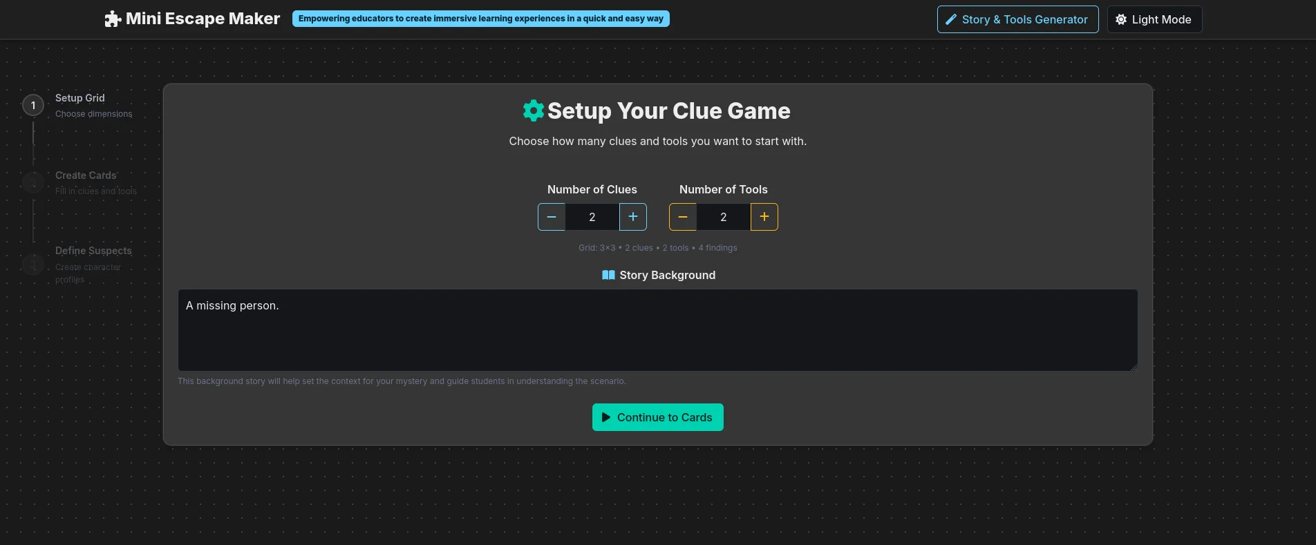 I took part on a project tentatively named “Mini Escape Maker” - an educational tool that lets teachers create interactive mystery games for their students. I focused mainly on the front-end implementation. Project Overview It’s a tool targeted towards educators to help build interactive mystery games (in the style of escape/clue games). The idea is you start with some mystery story where there’s an array of suspects. Educators then create pairings of clues and tools, and students can match them up in order to produce findings. ...